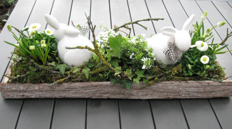 Holztablett+Frühlingsblüher+Porzellanhasen