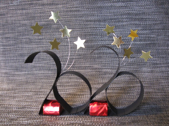 ...mit Kartonresten, Draht, Glitzersterne und zwei Pralinchen bastelst Du im handumdrehen schnell noch eine Sylvster Tischdeko für Deine Festtafel...